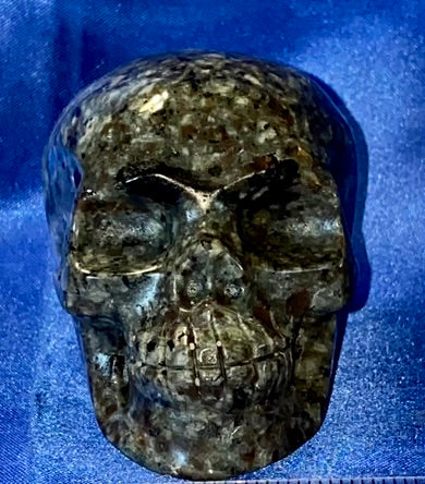 Yooperlite Stone Skull 2 (UV Reactive) - Halloween decor, spooky polished gray black stone sculpture glows red under blacklight